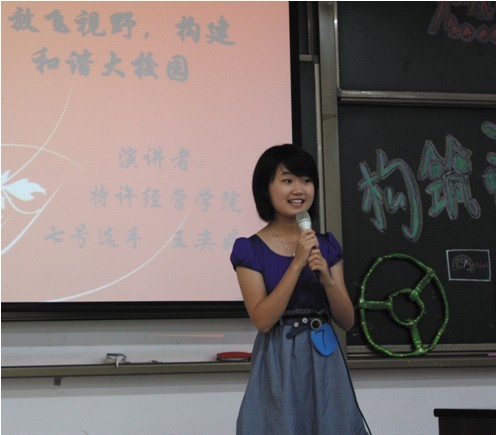 比赛的第一环节为主题演讲,选手们围绕此次比赛主题“燃烧青春激情,构筑和谐校园”进行4分钟的演讲,再由评委做第一轮打分。本轮中,来自特许经营学院的7号选手王奕婷和10号选手邵帅格外引人注目。王奕婷演讲的《放飞视野,构建和谐大校园》被评委老师认为是表达最流畅并且让人听了不乏味的一个。而邵帅的演讲则是引起了在座老师和同学对现有学生组织的共同思考。